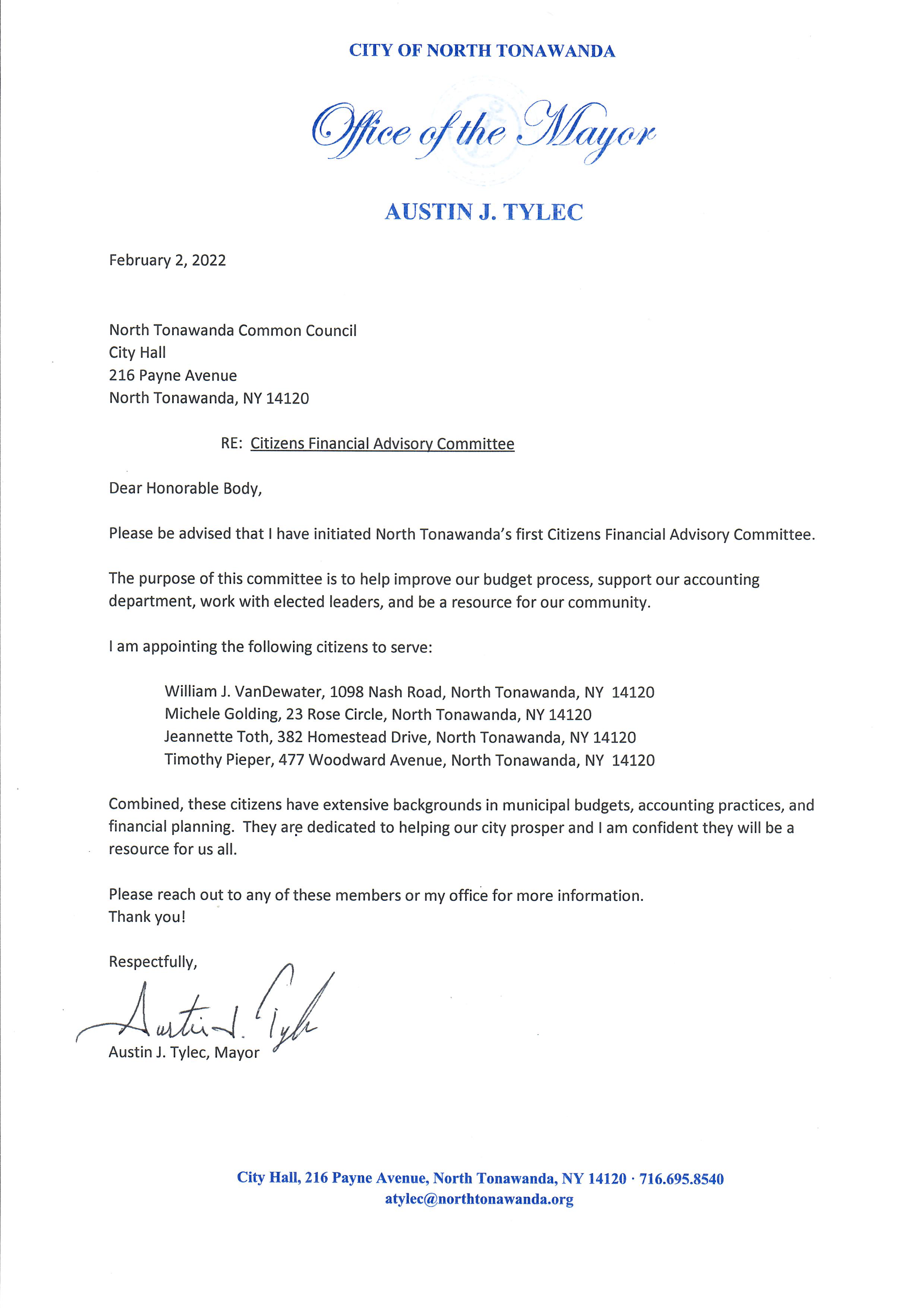Creation: Mayor Austin Tylec established the Financial Advisory Committee on Feburary 25th, 2022. This committee was created in order to improve the City's budget process and support its accounting department.